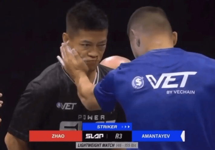 10月31日,沙特利雅得,中国选手赵鸿刚参加世界职业扇耳光大赛,对阵外国选手阿曼塔耶夫,第三回合被对手KO痛苦倒地,脸色惨白。比赛中,他眉角受伤需缝针,眼睛淤青。赛后他及时报平安,表示““没啥事,缝个针就好了”。赵鸿刚是祁家通背拳第九代传人,多次在武术交流赛中夺冠。(综合海报新闻)