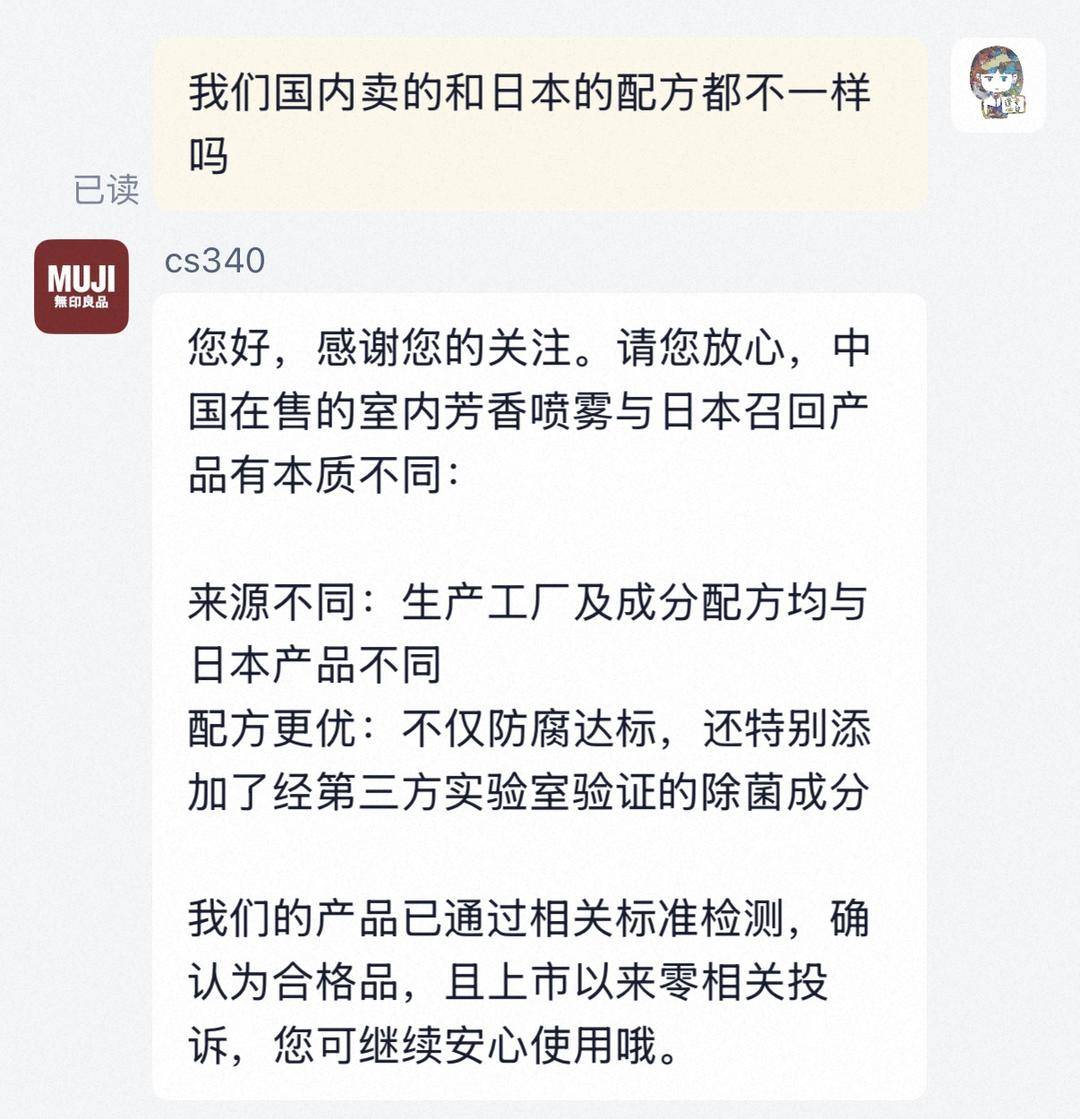 记者调查发现,该香氛国内无印良品线下门店仍有售卖,南京一门店员工告诉记者,此室内喷雾属于店铺热销款,在国内很受欢迎,目前国内没有收到召回通知国鸣投资,表明店里售卖的批次肯定是安全没问题的,顾客可以放心购买。